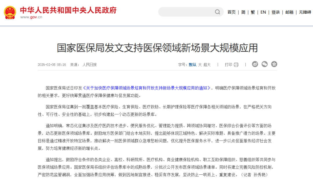 2026.2.08 《关于加快医疗保障领域场景培育和开放支持新场景大规模应用的通知》