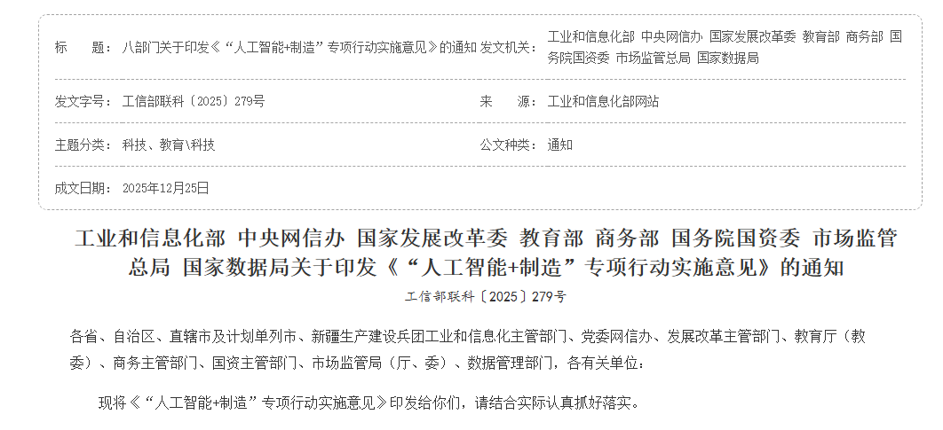 2025.1.7 工信部等八部门联合印发《“人工智能+制造”专项行动实施意见》