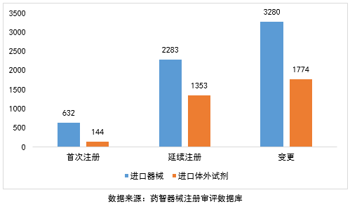 2016年,进口医疗器械注册受理共9466项。其中,医疗器械注册申请6195项,体外诊断试剂注册申请3271项。