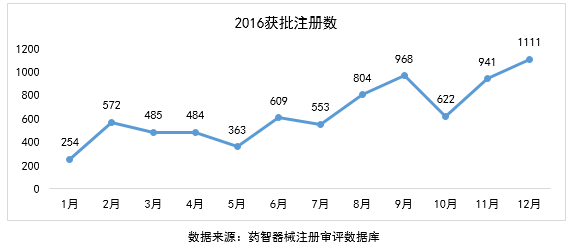 2016年医疗器械获批注册数总体呈现上升趋势,由1月份的254项获批到12月份的1111项获批,有了质的提升。虽然在5月份和10月份出现了一个小低谷,但在下一个月,获批数量就恢复正常并且持续上升。