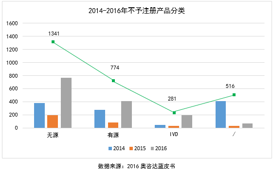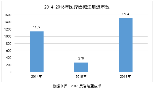 不予注册方面,2014年至2016年间,CFDA共发布了109次退审公告,退审产品数量达2912个。其中,2016年食品药品监管总局共对1504项医疗器械注册申请不予注册。2016年的评审效率明显提升了,清理了多年积压的项目,2016年的退审数量超过前两年总和的6.3%。