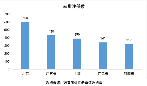 注册地区方面,2016在中国注册数量排前5位的省份分别是北京(600项),江苏省(430项),上海(390项),广东(341项)和河南省(319项)。与2015年相比,北京仍然高居榜首,获批注册数上涨了34%。其他省份也均有上涨,其中广东由原来2015年的第三位退到第四位,给原来第四位的上海反追,成为2016年获批注册数第三位。