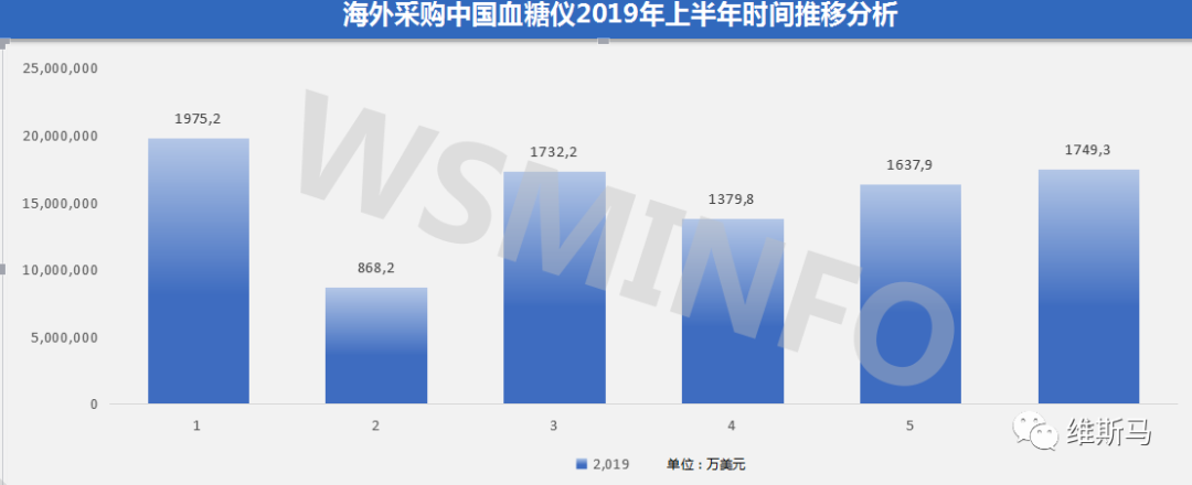 根据大连维斯马研究中心统计2019年上半年血糖仪数据,出口额最大的为1月1975万美元,最少的为2月868万美元。