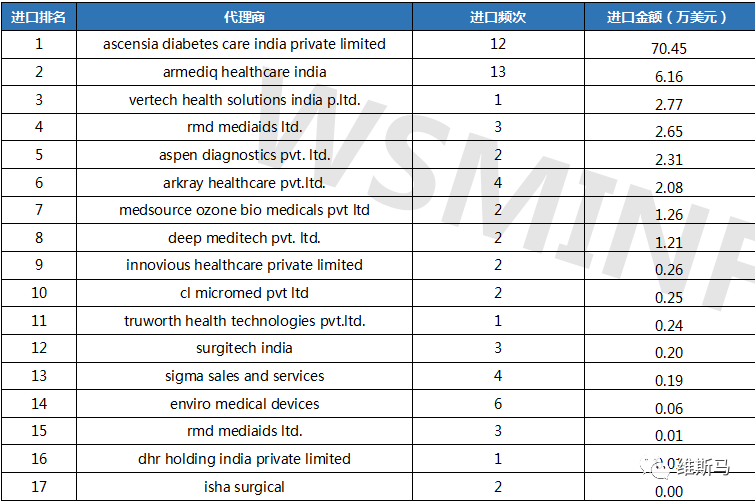 据维斯马IMEX医疗器械代理商系统统计:2019年1-6月印度市场共计进口系统共计90.1万美元。其中包含加工贸易及血糖仪周边产品及配件。主要原产国9个 。