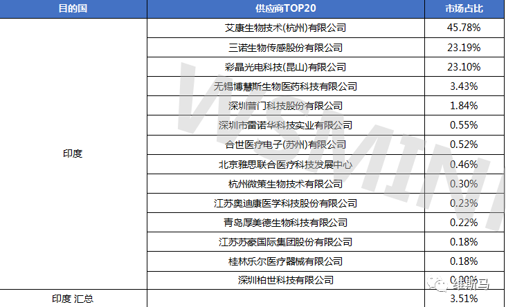 印度市场为中国血糖仪出口第六大市场,共计14家出口商,占全年血糖仪出口3.51%的份额,艾康生物在印度市场占有率为45.78%。