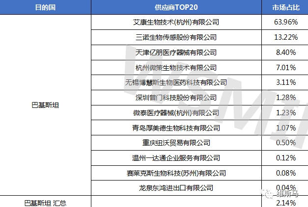 巴基斯坦市场为中国血糖仪出口的第八大市场,共计12家出口商,占全年血糖仪出口2.14%的份额,艾康生物在巴基斯坦市场是最大的出口商,占有率为高达63.96%。