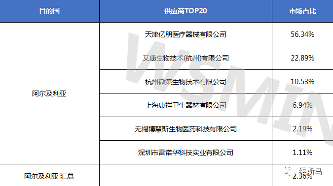阿尔及利亚市场为中国血糖仪出口第七大市场,共计6家出口商,占全年血糖仪出口2.36%的份额,亿朋医疗在阿尔及利亚市场占有率为56.34%。