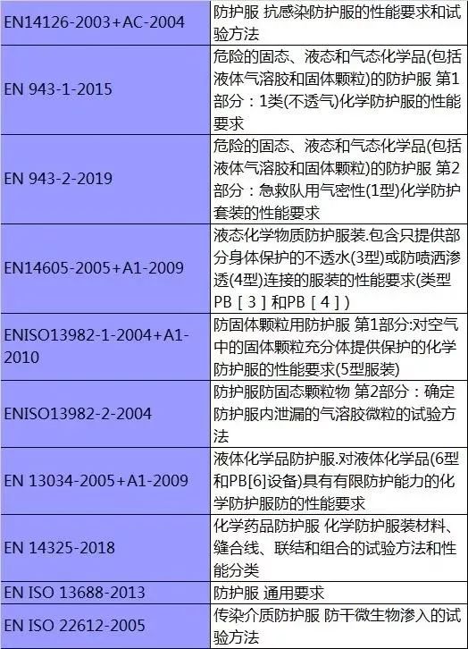 (6)欧标防护服由两个子标准体系组成,防感染的EN14126标准和抗气体、液体、固体颗粒渗透的TYPE子标准。按照针对防护的物体不同,欧标防护服分为6类TYPE:TYPE 1及TYPE 2类针对气体级防护、TYPE 3/4/6针对液体防护、TYPE 5针对固体及气溶胶颗粒防护及衣服的抗撕扯强度。欧标防护服的抗合成血液渗透测试参照标ISO 16603。该标准将防护服的抗合成液渗透测试等级分为6级,6级最高。ISO 16603的第2级(CLASS 2)和中国国标的级致,均为1.75kPa。欧标防护服需有EN14126字样,并最少达到TYPE4,才符合我国国标。