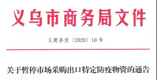 澎湃新闻了解到,义乌市于5月9日同时下发了《关于暂停市场采购出口特定防疫物资的通告》,提醒义乌市对外贸易经营主体,从2020年5月1日起,对伪报、瞒报通过市场采购贸易出口上述“5+1类防疫物资”的,一经查获,从严处罚。
