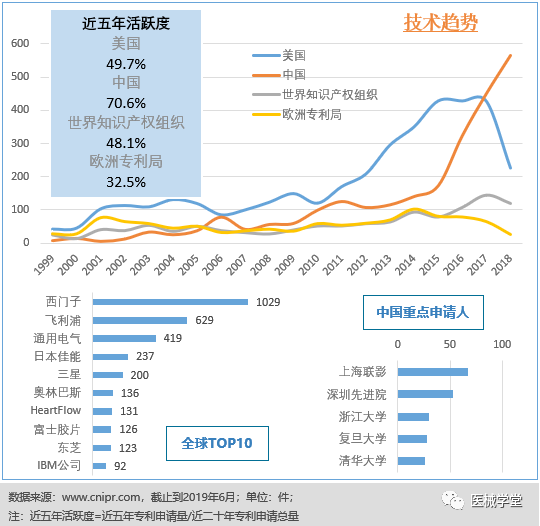 大数据、物联网、人工智能等新兴技术是未来医疗的发展方向,而目前人工智能与医学影像的结合已成为智慧医疗最热门的发展领域之一,人工智能+ 医学影像也成为热门的投资方向。从人工智能+ 医学影像领域的专利申请趋势来看,近五年全球专利申请的活跃度高达47.8%,2010 年以来进入技术创新的活跃期,从不同区域来看,美国近五年的活跃度达49.7%,而中国在2015 年之后专利申请保持较高的增速,近五年的活跃度高达70.6%,成为技术发展热点最高的区域。