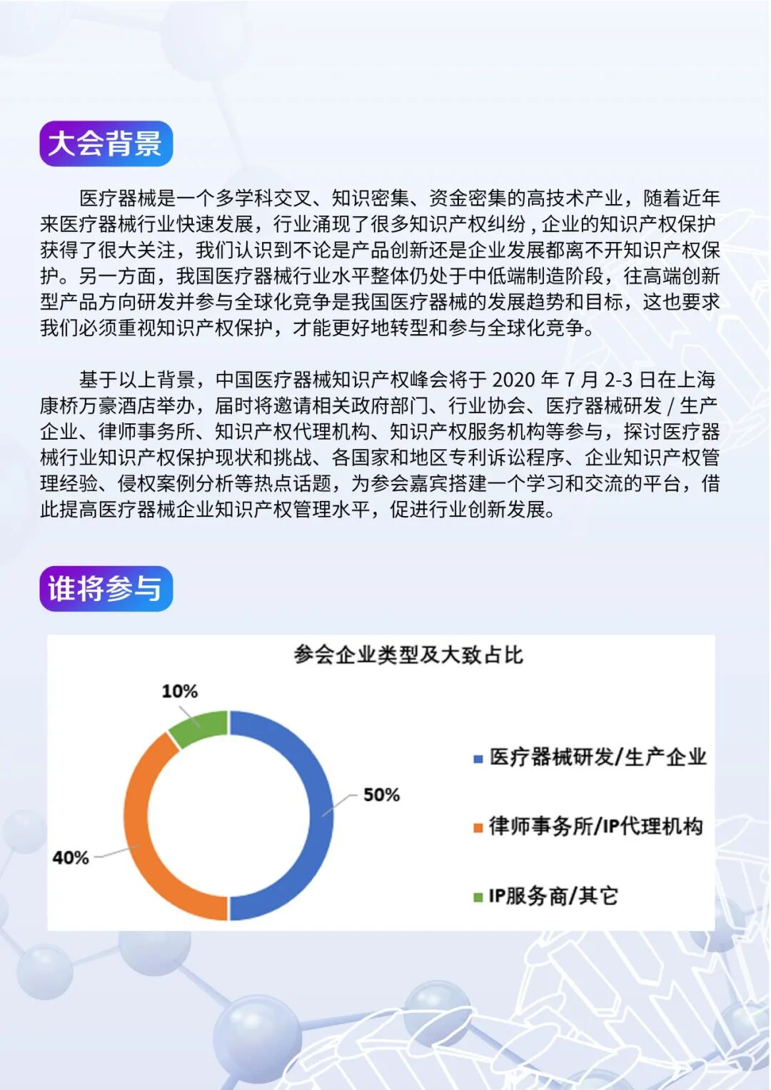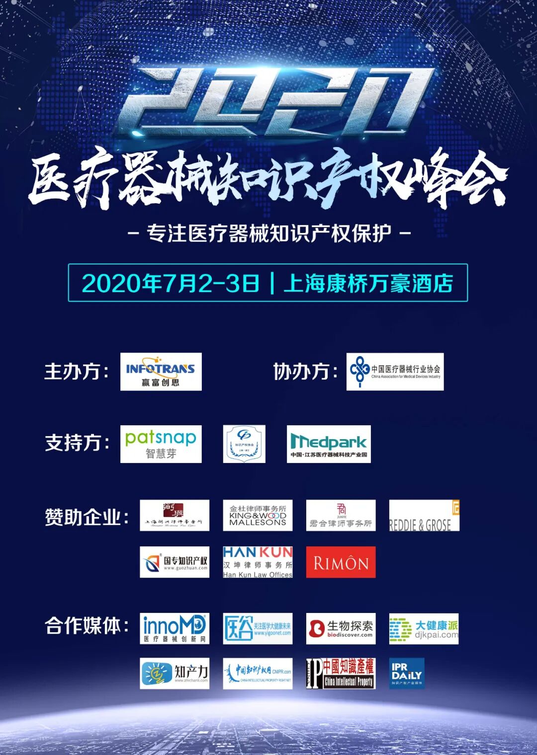 为贯彻落实党中央关于应对新冠肺炎疫情防控工作部署,全力配合做好疫情防控工作,切实保障参会人员的身体健康和生命安全,综合考虑当前疫情防控形式,经组委会研究决定,中国医疗器械知识产权峰会2020将延期至7月2-3日举办,地点仍在上海康桥万豪酒店。我们将密切关注疫情变化,后续会议进展将通过公众号、邮件、微信、短信等方式通知您。会议延期造成诸多不便,我们深表歉意,组委会将全力做好后续服务工作。感谢各有关单位一直以来对我司工作的支持与信任。我们将积极发挥服务作用,与大家共渡难关,大会报名通道现已恢复正常(文末有参会费用标准),可以继续接受报名。