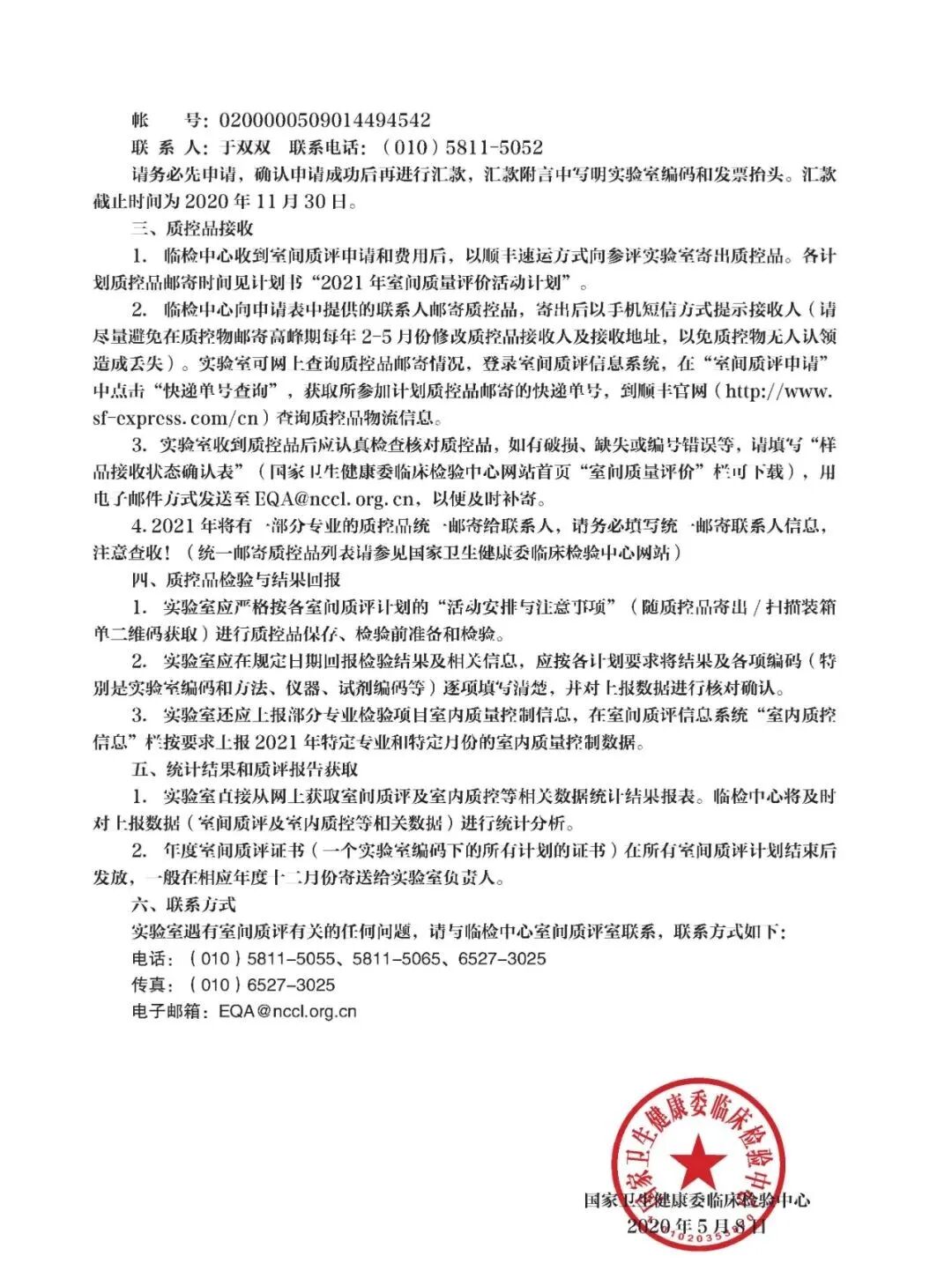 1. 2021年室间质量评价申请日期为自通知发出之日起至2020年11月30日,各参评实验室应在截止日期前提出申请。由于每年购买或制备的质控品数量有限,各专业随质控品数量剩余情况可能随时截止,望尽早申请,先到先得。