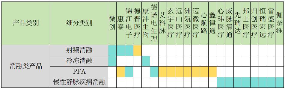 通过查询TOP10企业官网FDA上市产品管线及已公开资料中提及的未来研发管线,按照疾病大类将产品管线进行分类整理,如下图所示:其中绿色是指已上市产品、红色是指即将上市(近期PMA公示)、黄色是指在研产品。