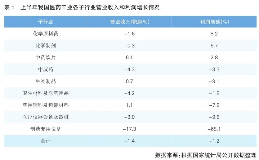 根据国家统计局数据,今年上半年,规模以上医药工业增加值同比增长1.2%;规模以上企业实现营业收入14465.5亿元,同比下降1.4%;实现利润2111.2亿元,同比下降1.2%。以上三项指标的增速分别低于全国工业整体增速4.8、4.3和4.7个百分点,改变了多年来在工业领域领涨的态势。积极的变化是,分季度看,自2023年下半年以来,行业主要经济指标有所改善,工业增加值重回正增长,营收、利润降幅收窄。