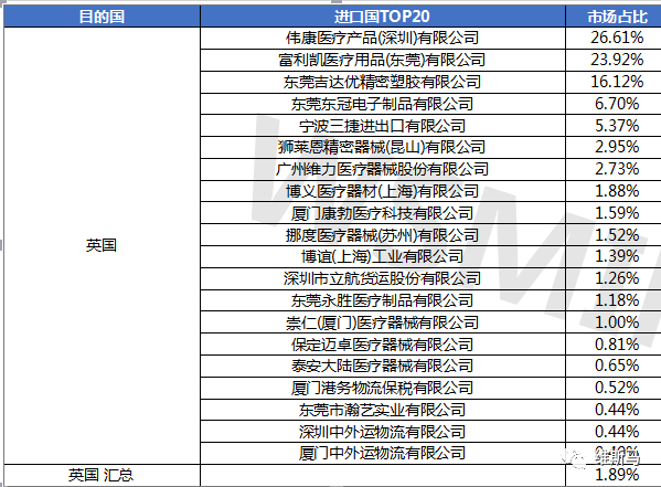 英国市场为中国呼吸系统医疗器械及耗材出口第十大市场,共计57家出口商,占全年呼吸系统医疗器械及耗材出口1.89%的份额,伟康医疗在英国市场占有率为26.61%。