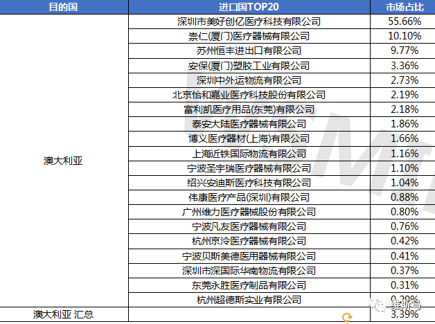澳大利亚市场为中国呼吸系统医疗器械及耗材出口第六大市场,共计67家出口商,占全年呼吸系统医疗器械及耗材出口3.39%的份额,美好创医疗在澳大利亚市场占有率为55.66%。