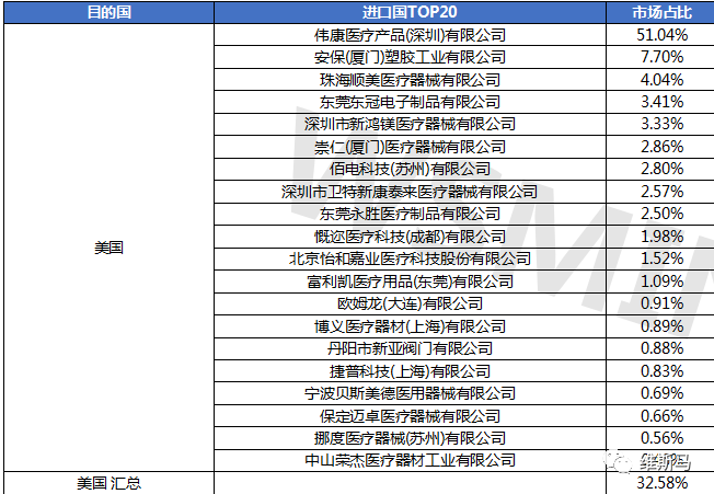 美国市场是中国呼吸系统医疗器械及耗材出口最大的市场,共计195家出口商,占全年呼吸系统医疗器械及耗材出口32.58%的份额,伟康医疗在美国市场占有率高达51.04%,领先于其他出口商。