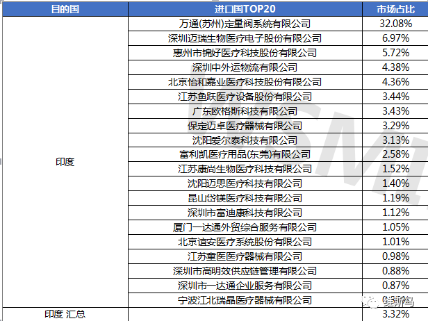 印度市场为中国呼吸系统医疗器械及耗材出口第七大市场,共计154家出口商,占全年呼吸系统医疗器械及耗材出口3.32%的份额,万通(苏州)在印度市场占有率为32.08%。
