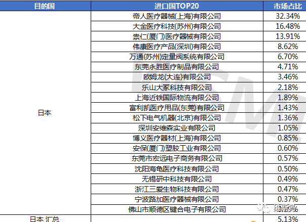 日本市场为中国呼吸系统医疗器械及耗材出口第五大市场,共计53家出口商,占全年呼吸系统医疗器械及耗材出口5.13%的份额,帝人医疗在日本市场占有率为32.34%。