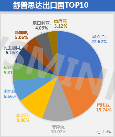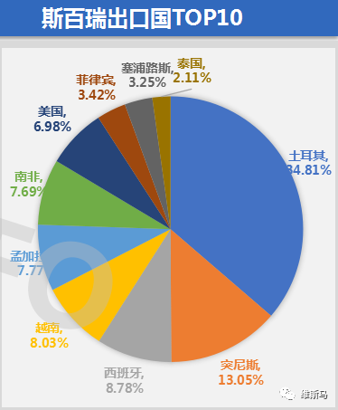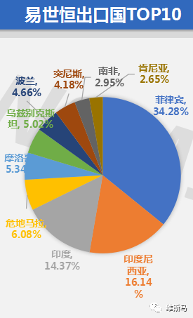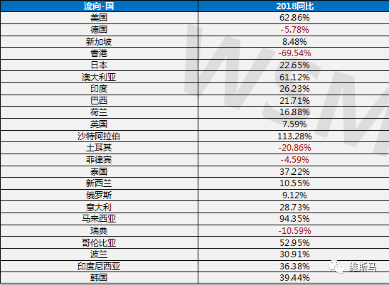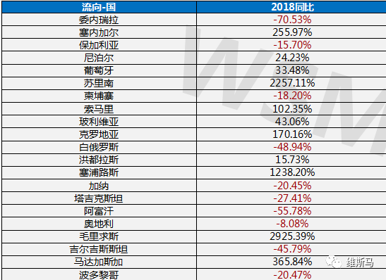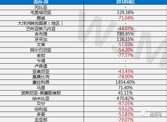 根据维斯马研究中心统计:2019年上半年出口流向国同比增长国91个,同比2018年出口国下降62个国家。
